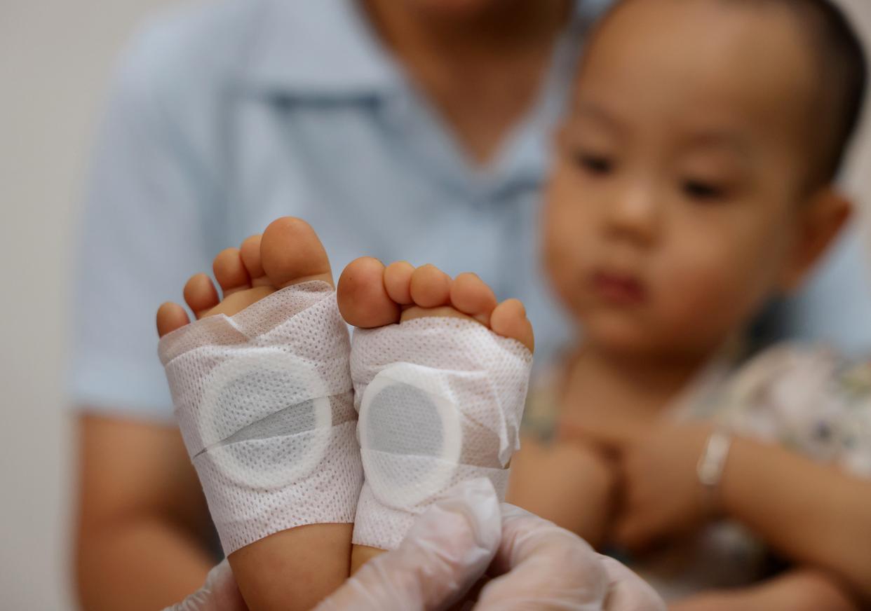 7月20日,在河南省信阳市光山县人民医院,医务人员为小朋友贴“三伏贴”。新华社发(谢万柏 摄)
