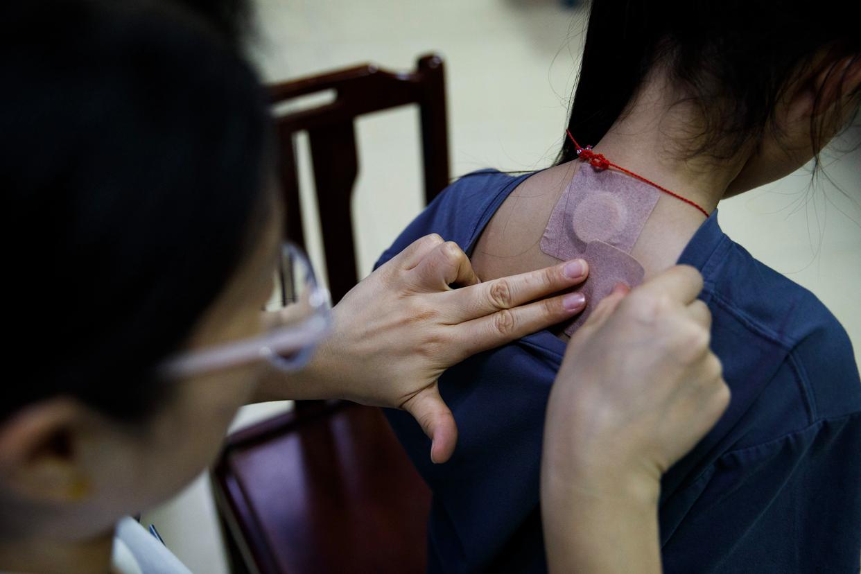 7月20日,河北省遵化市第二医院中医科的中医师在给市民贴“三伏贴”。新华社发(刘满仓 摄)