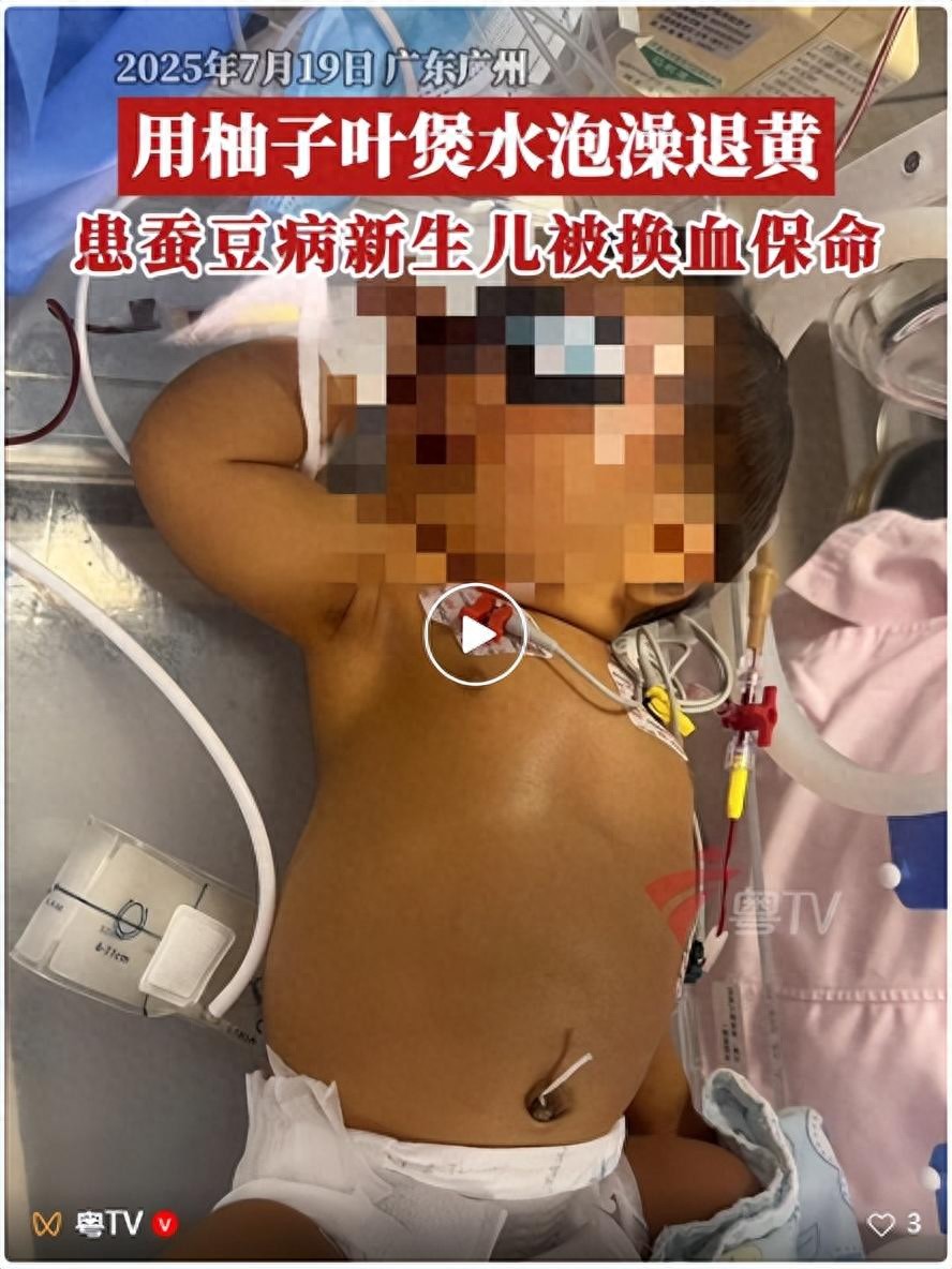 入院后检查结果显示,患儿被确诊为重症高胆红素血症。 医生当机立断,给宝宝进行换血治疗,并给家长下达了病危通知书。医生了解得知,原来这名宝宝患有蚕豆病,胆红素浓度突然飙升,家人误信偏方用柚子叶给其泡澡。