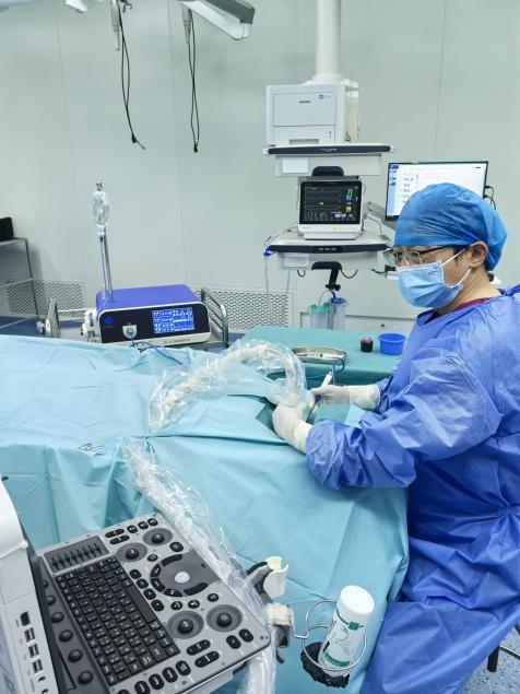 经邵挥戈团队综合评估,决定为柳先生实施超声引导下甲状旁腺微波消融术。手术在局部麻醉下进行,邵挥戈借助高频超声锁定患者颈部4枚失控的甲状旁腺组织,在超声引导下持微波消融针精准刺入目标腺体,消融针尖释放微波能量,瞬间产生60℃可控高温,使其精准凝固坏死、功能丧失。