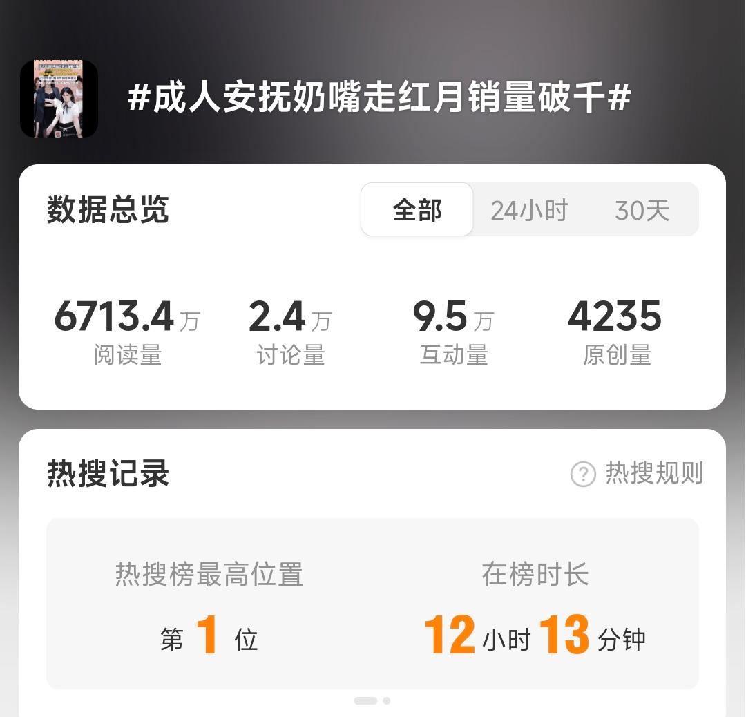 近日,话题“成人安抚奶嘴走红月销量破千”冲上热搜第一,而在某社交平台,该内容视频播放量已突破2亿次。在众多博主的测评分享中,有人声称靠它戒掉了烟瘾,有人表示在它的帮助下控制住了食欲,更有甚者整夜都含着奶嘴入眠,一觉醒来直言确实有被治愈到。