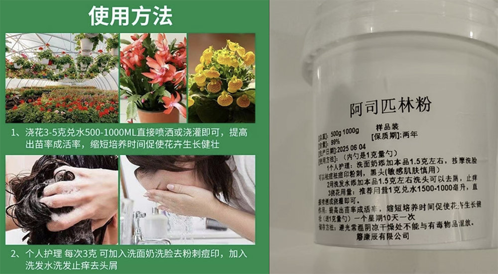 宣称洗头、洗脸、浇花“三合一”的阿司匹林、阿莫西林粉末,竟还对去屑止痒、去黑头闭口粉刺有“奇效”?