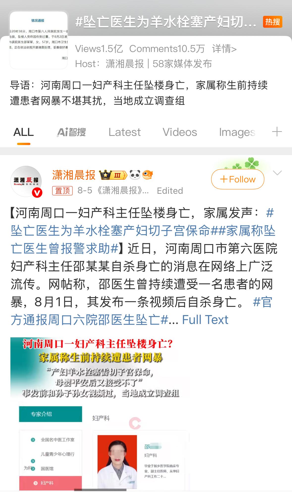 最近,河南周口市卫健委的一则通报,让公众心痛不已——周口市第六人民医院妇产科主任不幸坠楼身亡。她的丈夫对媒体透露,妻子生前竟遭受了长达7个月的网络暴力。这场悲剧的导火索,源于三起医疗纠纷,其中的第一起是一名产妇因羊水栓塞必须切除子宫保命,家属虽签署同意书,却在产妇诞下女婴后反悔,以“花费50多万娶媳妇,却断了香火”为由,索要百万赔偿,并在社交媒体上持续网暴主刀医生。