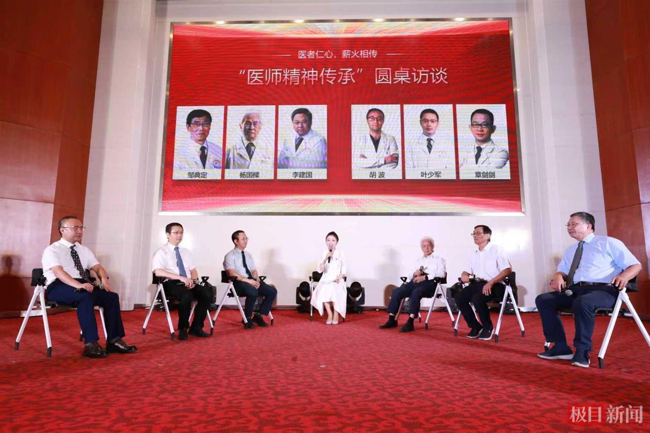 医者仁心,薪火相传。在圆桌访谈环节,肿瘤外科教授杨国樑、儿科教授邹典定、重症医学科教授李建国三位老专家,与“国家优秀青年医师”叶少军、章剑剑、胡波面对面,谈奋斗,话使命。老专家们深情回顾数十年工作历程,从救治患者到院徽设计的点点滴滴,诠释“人民至上、生命至上”的医者仁心;青年医师分享了他们在医学创新中的探索实践,展现了新时代医者的使命担当。这场两代医者的对话,以真挚的情感和质朴的语言,感染了在场每一位医务工作者。