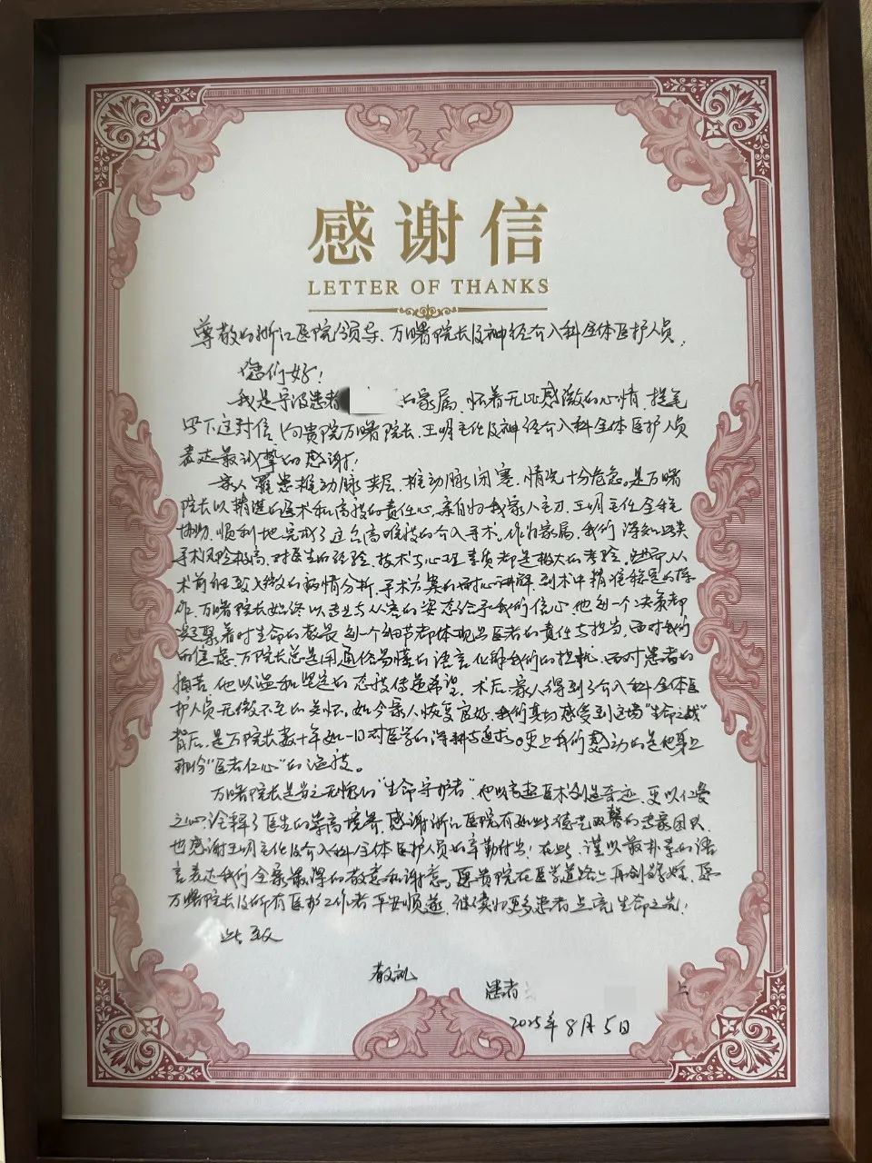 术后,陈先生恢复理想,不久便平安出院。8月上旬,陈先生前往浙江医院三墩院区复查,身体各项指标一切正常,曾经命悬一线的阴霾被彻底消散。感激之情无以言表,陈先生的妻子饱含深情地手书了一封感谢信。这封感谢信,陈先生的妻子前后写了好几遍,用了专门的纸张,最后挑选了一封自己最满意的交到了医护团队的手上。