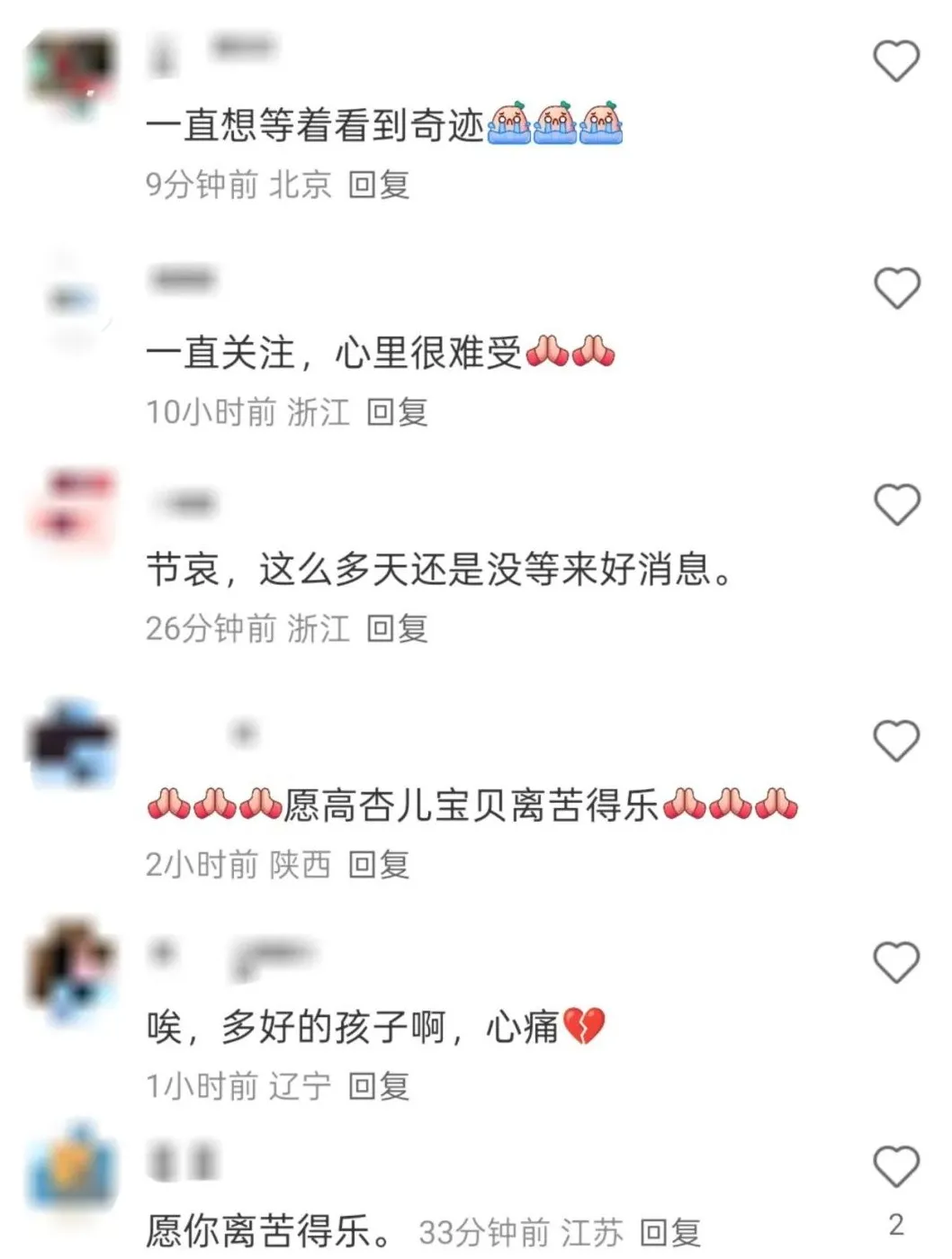 6月30日杏儿妈妈又发布消息称,孩子的情况有新变化,“这两天肌酸激酶已经超过了1000,昨天的血压又低了。用了新的药两天多了,唯一看到变好的指标是c反应蛋白。”此前,医生曾说基本没有几率熬过急性期,就算熬过了最好的结果也是植物人。