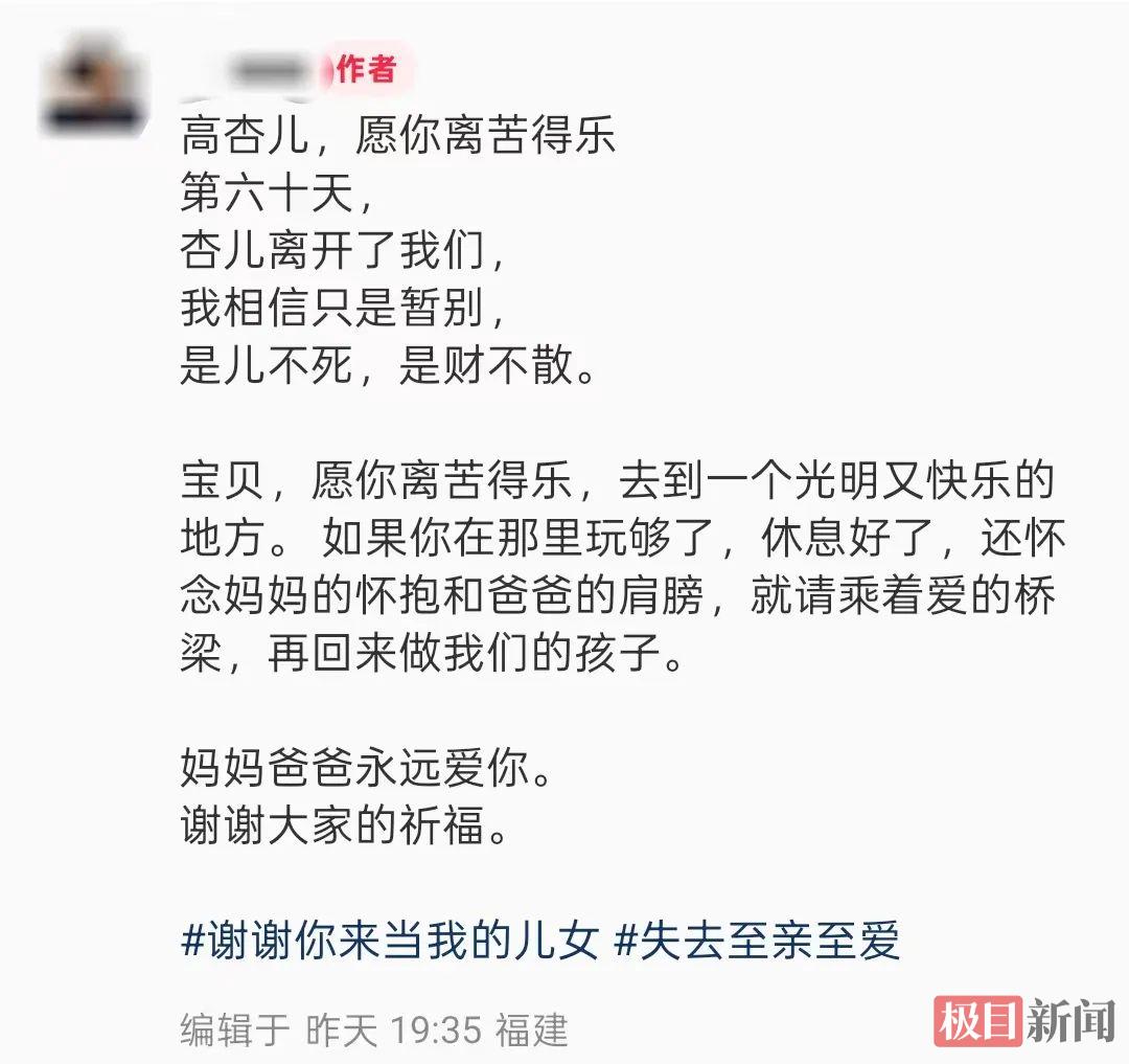 8月22日晚,感染“食脑虫”的福建5岁女孩高杏儿的妈妈发文悼念去世的女儿,透露在抢救60天后女儿还是离开了。