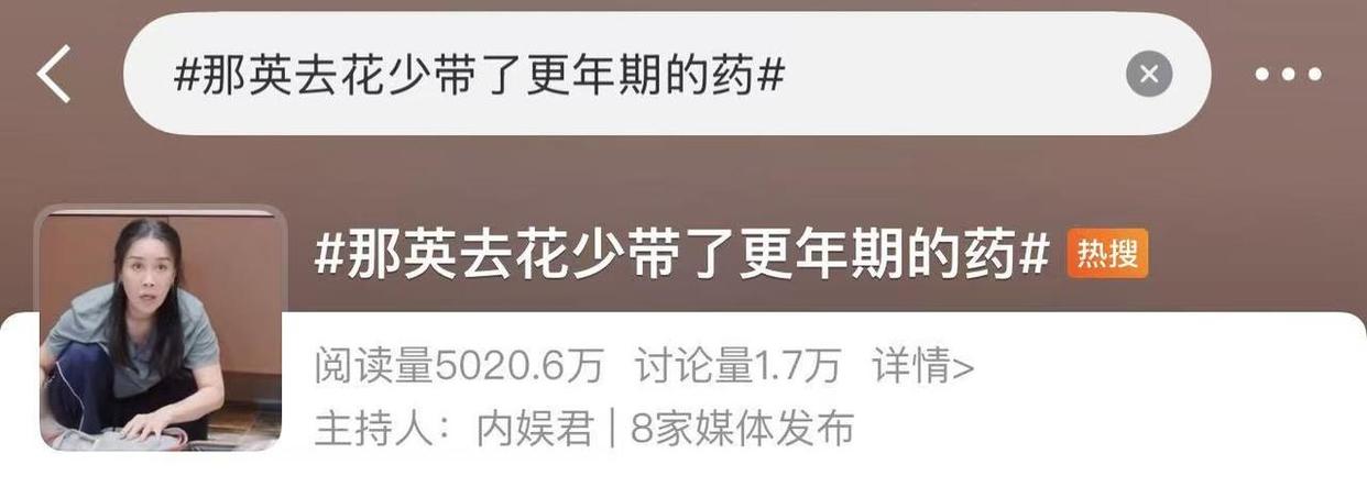 近日,在一档综艺节目中,歌手那英在行李检查环节的一句“50岁更年期的药都得带”,如同一颗投入平静湖面的石子,激起了全网涟漪,引发热议。
