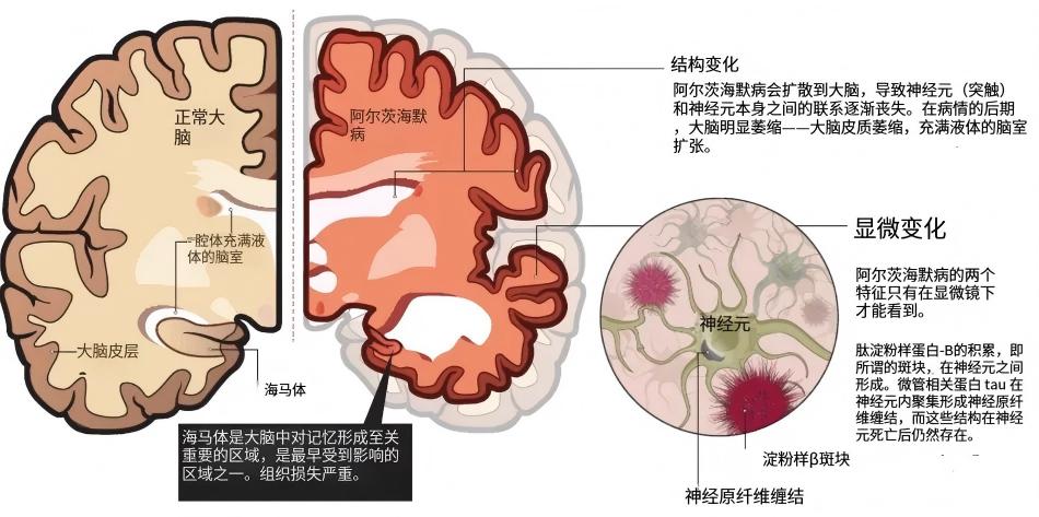 正常大脑与阿尔茨海默病大脑的结构差异(图片来源:参考文献[2])