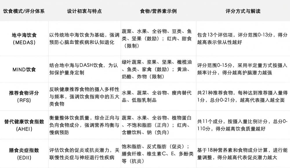 研究重点评估了五种饮食模式及对应的评分体系的护脑效果,包括地中海饮食(MEDAS)、MIND饮食、推荐食物评分(RFS)、替代健康饮食指数(AHEI)以及膳食炎症指数(EDII),它们的具体特点和评估方式如下: