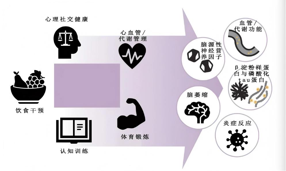 除饮食外,针对降低痴呆风险的体育运动、认知训练、血管代谢管理以及心理社会支持的单一干预研究,已对影响机制做出了初步探索: