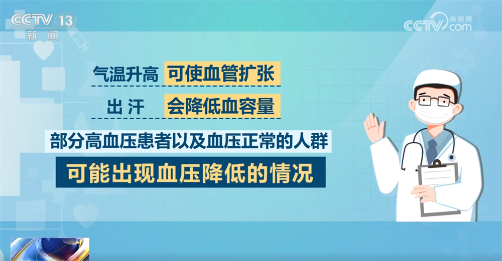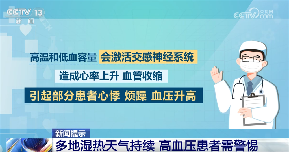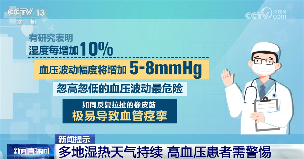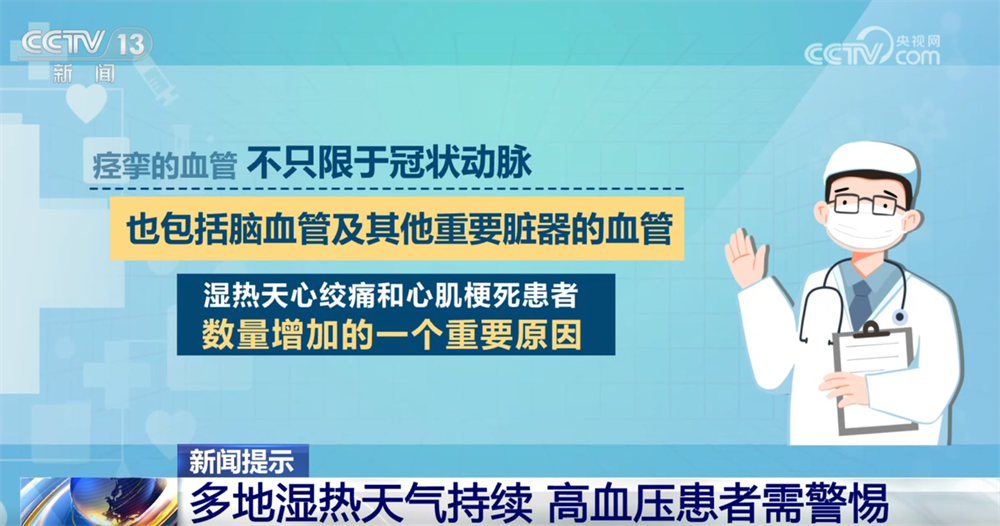 记者在北京宣武医院了解到,由于湿热气候严重,这一时期高血压患者应特别注意由于湿热导致的血压波动和血管痉挛。