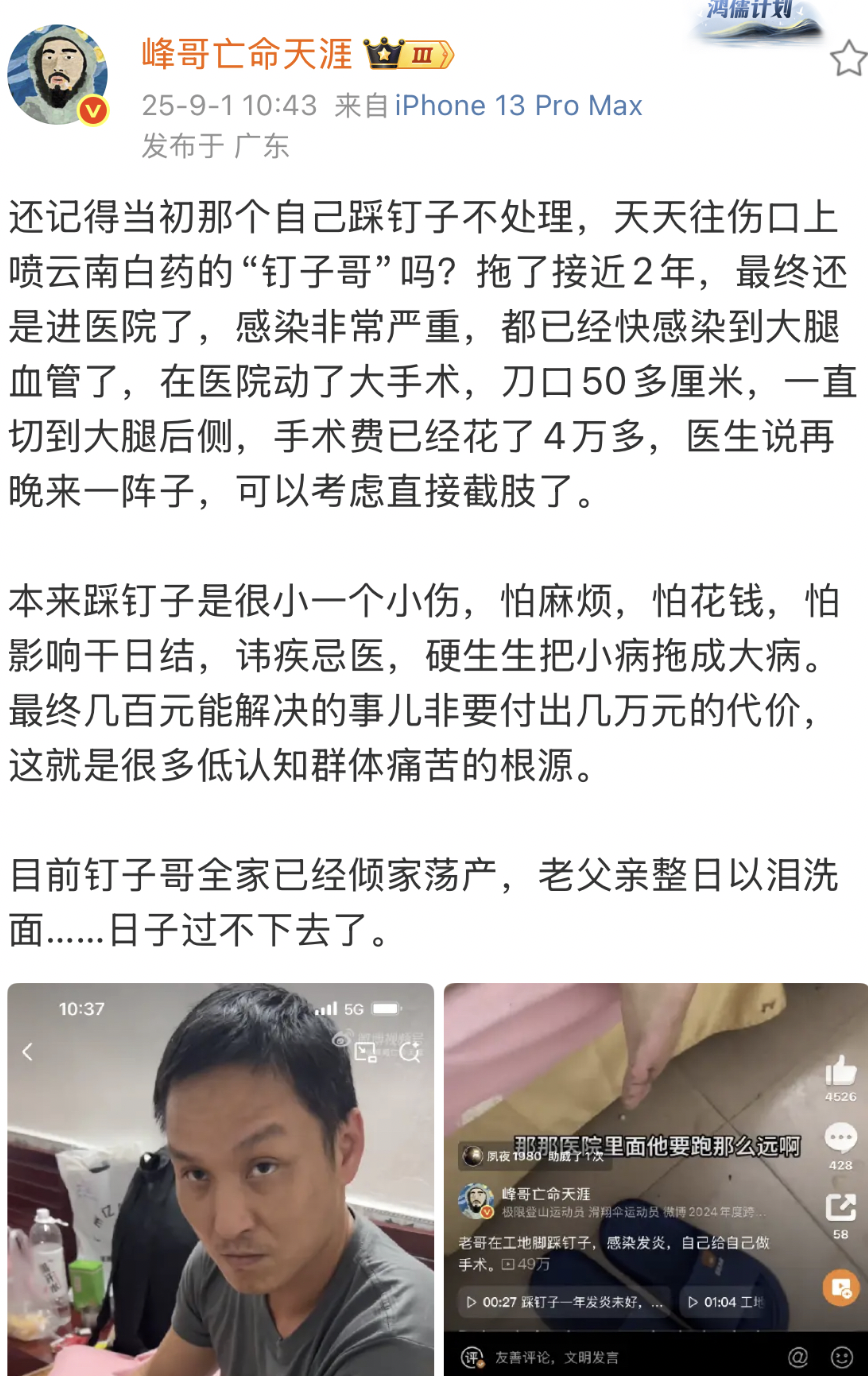 9月1日,微博博主@峰哥亡命天涯发博称,一男子踩了钉子不处理,天天往伤口上喷云南白药,拖了接近2年,最终进了医院,一查感染非常严重,快接近大腿血管了。动完手术后,刀口都有50多厘米,一直切到大腿后侧,手术费已经花了4万多。