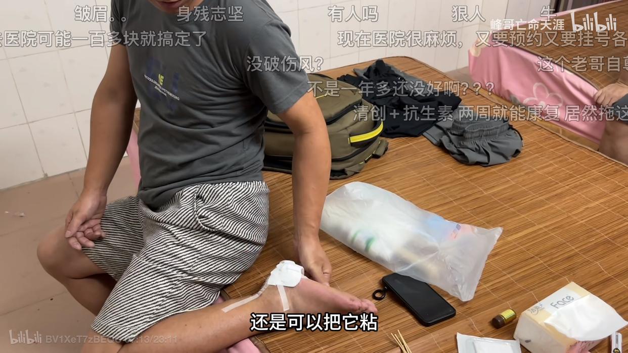 今年6月份,博主曾发布视频,男子踩了钉子一年多不处理,平时还要出门干体力活。出门前,男子用喷头冲伤口,喷上云南白药,用白纸盖住伤口缠上绷带,套上袜子就出门。男子还自称为了穿鞋子,用剪刀剪掉了伤口里长出来的“烂肉”,他也被网友叫作“钉子哥”。视频中,博主劝其去医院,“钉子哥”却不当回事。