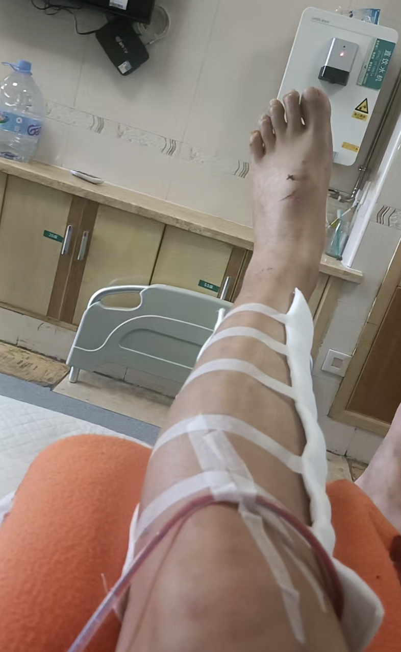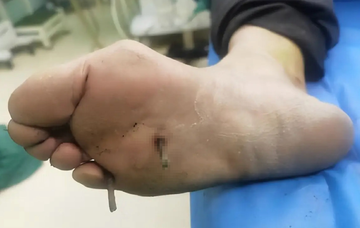程先生回忆,2023年9月27日,他在广州一家水厂打临时工,晚上打着手电筒下到负二层检查,水有十厘米深,应该是水里有块带钉子的木板,他从台阶跳下水一脚踩中了。程先生说,钉子没扎多深,他干体力活难免受些小伤,之前也被钉子扎过脚,那次自愈了。一个月后,脚上的伤口结痂他给抠掉了,伤口却不愈合了,他买了消毒水也没用。