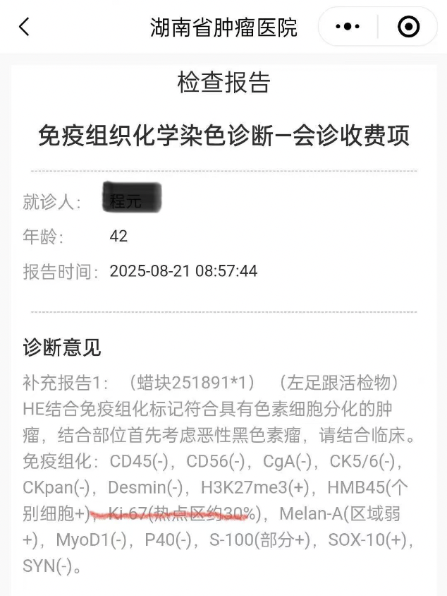 今年8月中旬,程先生才回老家医院做检查,并转到了湖南省肿瘤医院做手术,医院推测为“恶性黑色素瘤”。程先生说,他的脚上本来有三颗黑痣,三年前钉子又刚好扎在那个位置,可能引起了病变。术后医院做了免疫组化(是一种通过抗原抗体反应检测组织或细胞中特定蛋白质表达的技术,广泛应用于病理诊断、肿瘤研究及感染性疾病诊断等领域。)这两天结果会出来,如果是良性就还好,但万一是恶性的,程先生还要进行二次手术,不排除截肢的可能。