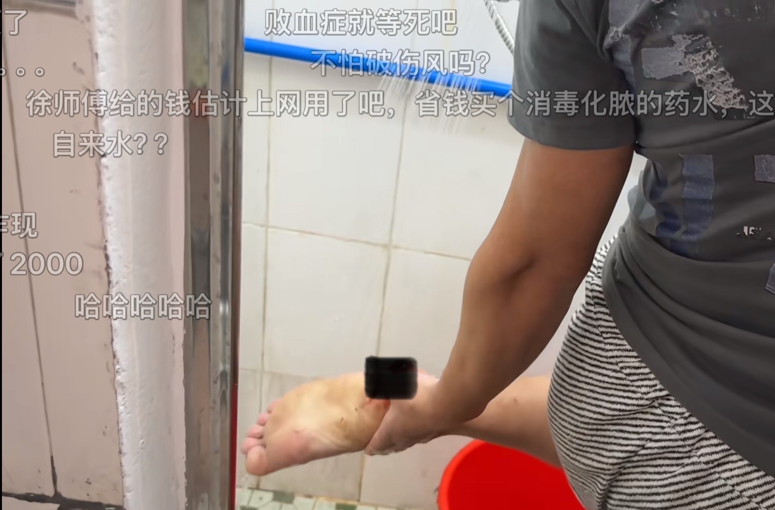 “钉子哥”平时就要自来水冲洗伤口。网络截图。