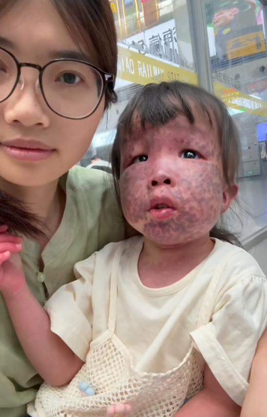 吴女士介绍,圆圆是先天性的基因突变,“通俗来说是先天性的血管畸型,也就是鲜红斑痣。”圆圆出生时,全身90%都是红斑,“生出来的时候颜色更深,都是黑紫色的,从她满月开始,就在做治疗。”如今,圆圆仍每个月或每两个月去治疗一次。