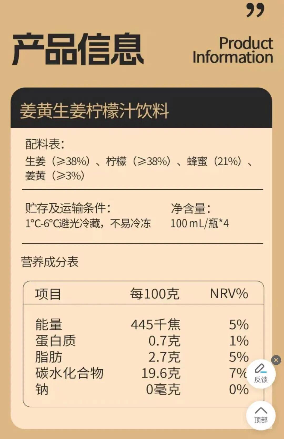根据产品信息表显示,这款100ml的姜黄shot瓶含生姜(≥38%)、柠檬(≥38%)、蜂蜜(21%)、姜黄(≥3%)。