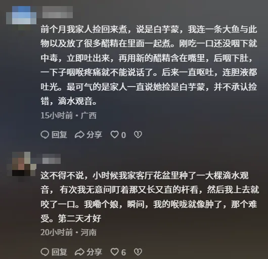 视频发出后,不少网友在评论区讲述自己误食“滴水观音”的经历。