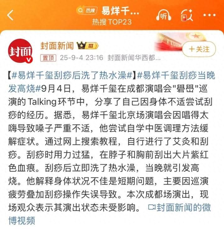 9月4日,易烊千玺在成都演唱会中,和粉丝们分享了自己因身体不适自行尝试刮痧,最后引发高烧的经历。易烊千玺表示,自己演唱会唱得太嗨导致嗓子严重不适,搜索了网上的教程后,自行进行了艾灸和刮痧,刮痧时用力过猛,在脖子和胸前刮出了大片紫红色血痕。当天刮痧后,易烊千玺立即洗了热水澡,没想到当晚就引发高烧。