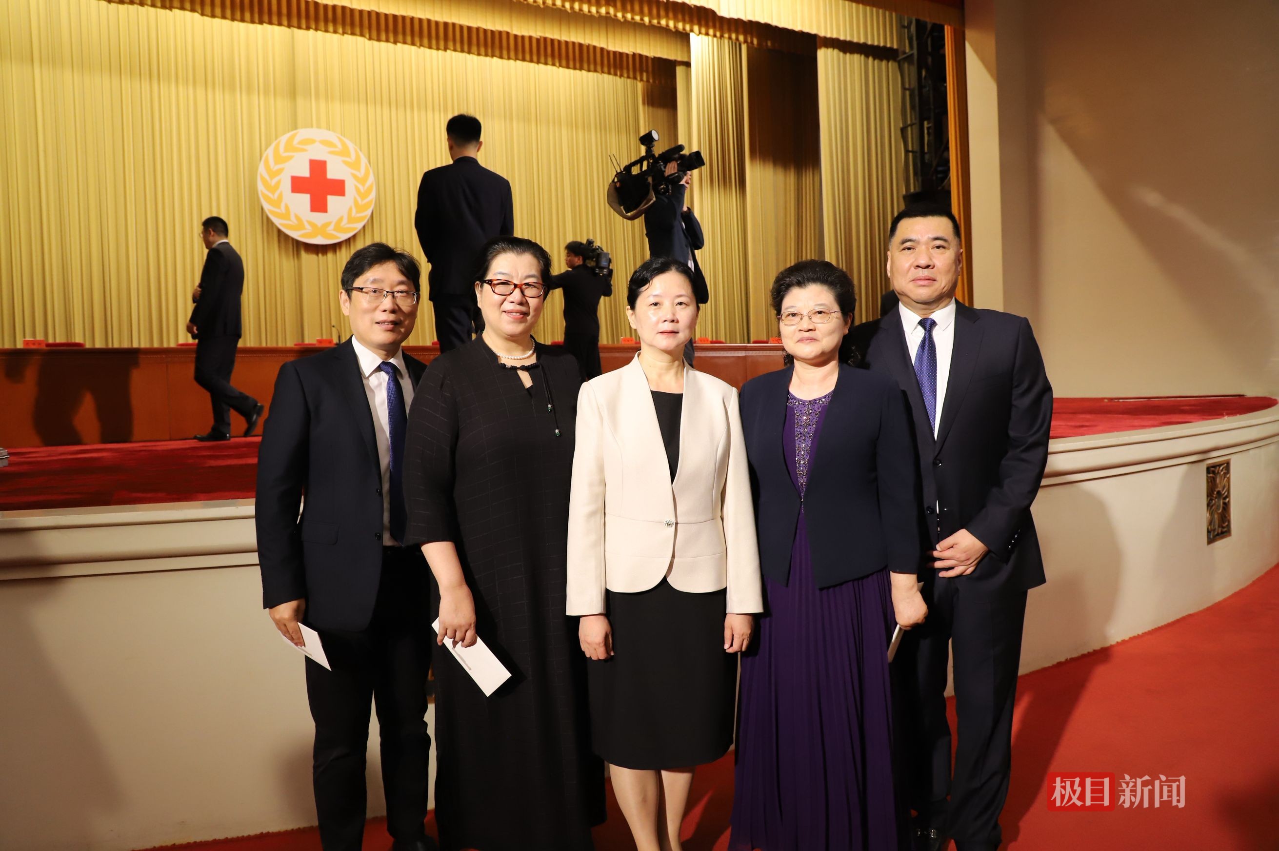 湖北省红十字会党组书记、常务副会长涂明珍(右二),省卫生健康委二级巡视员向清(左二),武汉大学中南医院党委副书记谭金海(右一)在颁奖现场与冯玲(左三)合影