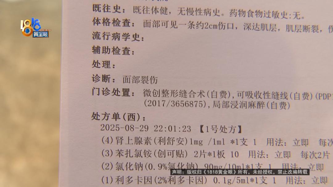 陈女士:最后缝的美容针,肯定要缝美容针。而且我问过医生缝美容针会不会留疤,他说肯定会留疤的。你说女孩子脸上留疤了……