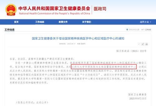 红星新闻记者从四川大学华西医院获悉,2025年9月17日,国家卫生健康委员会正式印发《关于增设国家精神疾病医学中心和区域医疗中心的通知》,批准该院作为主体单位设置国家精神疾病医学中心,这是我国西部首个综合医院获批国家医学中心,也是该院首个国家医学中心。
