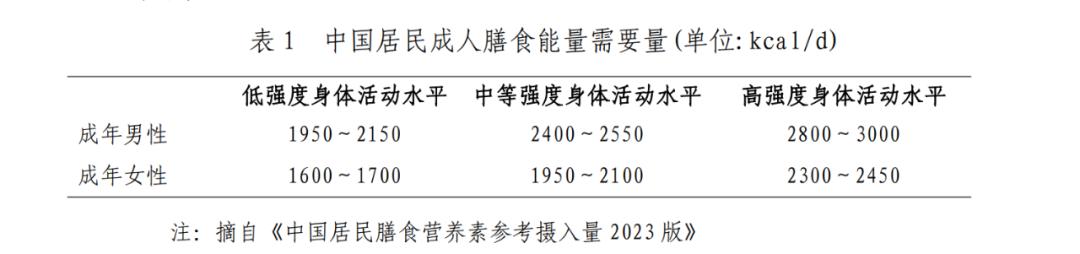 ● 控制总能量摄入和保持合理膳食是体重管理的关键。控制总能量摄入,可基于不同人群每天的能量需要量(如下表),推荐每日能量摄入平均降低30%~50%或降低500~1000kcal,或推荐每日能量摄入男性1200~1500kcal、女性1000~1200kcal的限能量平衡膳食。