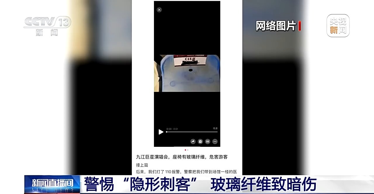 前段时间,有网友说自己去江西九江某体育馆观看演出时身上持续疼痛,发现身上有很多闪亮的小点,疑似玻璃纤维。随后前往医院诊断,确认扎到了玻璃纤维。后续相关单位确认座椅扎人一事属实。