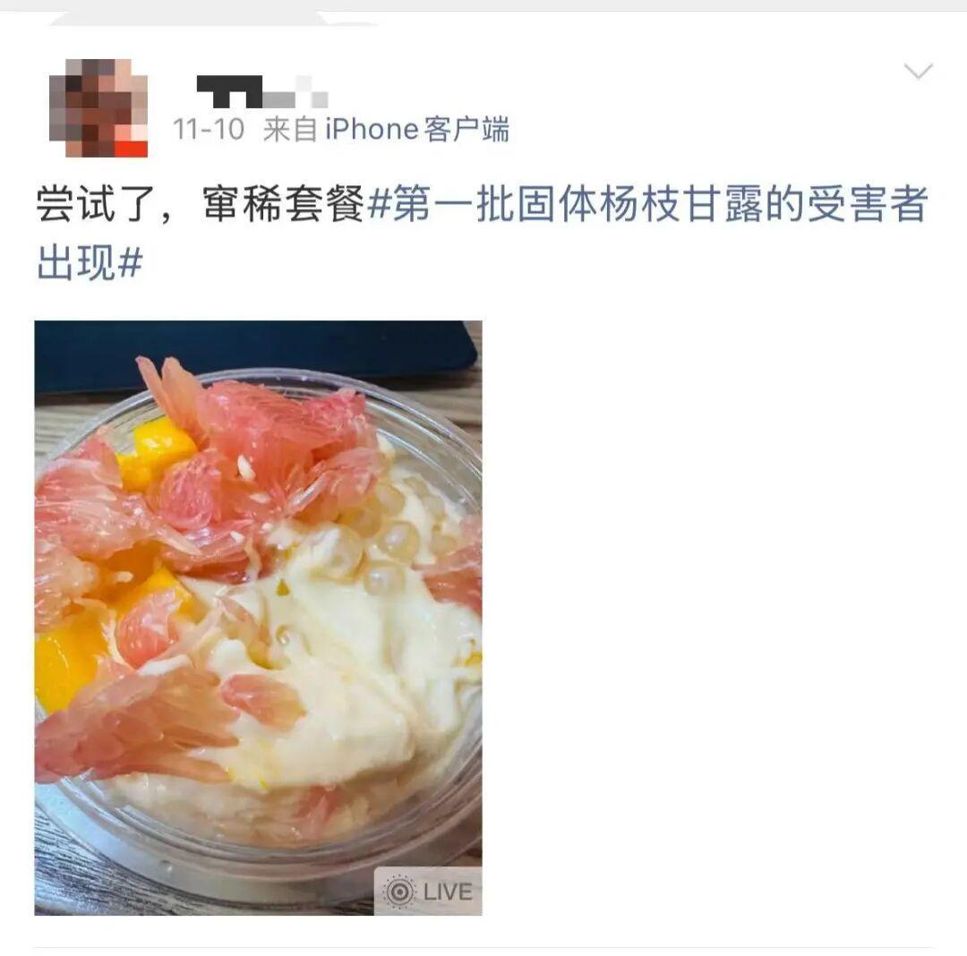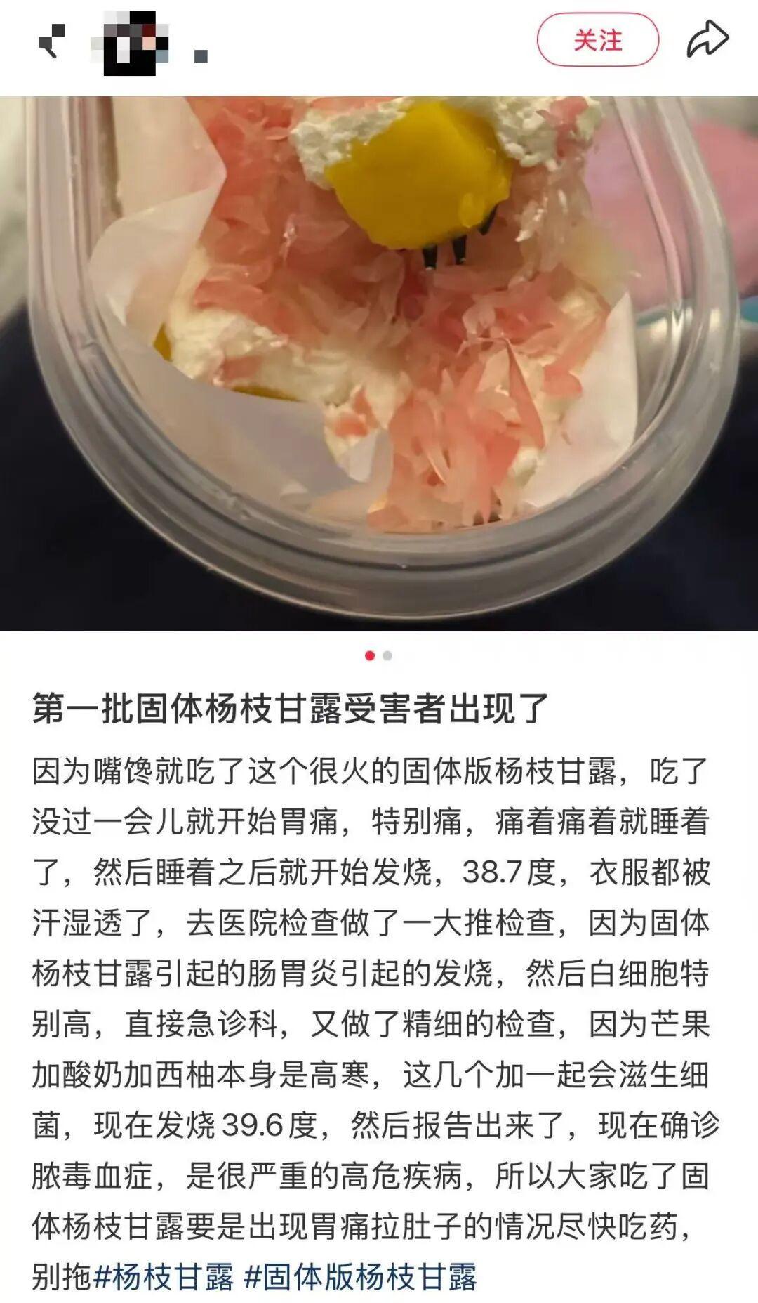 在固体杨枝甘露走红的同时,#第一批固体杨枝甘露受害者#相关话题也出现在社交平台上,有部分网友表示固体杨枝甘露是“窜稀套餐”,甚至有人食用后肠胃痉挛,疼得去看医生。