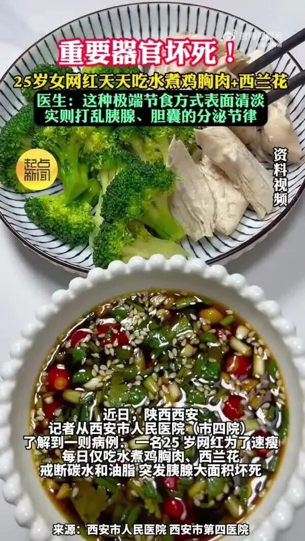 近日,陕西西安。起点新闻记者从西安市人民医院(市四院)了解到一则病例: 一名25岁网红为了速瘦,每日仅吃水煮鸡胸肉、西兰花,戒断碳水和油脂,突发胰腺大面积坏死。医生解读:胰腺分泌胰液需脂肪刺激,长期极低脂饮食会导致胰液淤积,一旦胰蛋白酶原在胰腺内被异常激活,就会“自己消化自己”,引发急性胰腺炎,严重可致命。像这位女士这样极端节食,表面清淡,实则打乱了胰腺、胆囊的分泌节律。健康减肥核心是热量缺口+代谢稳定,不是“吃的越少越好”,每餐吃到“不饿但还能再吃几口”就停。