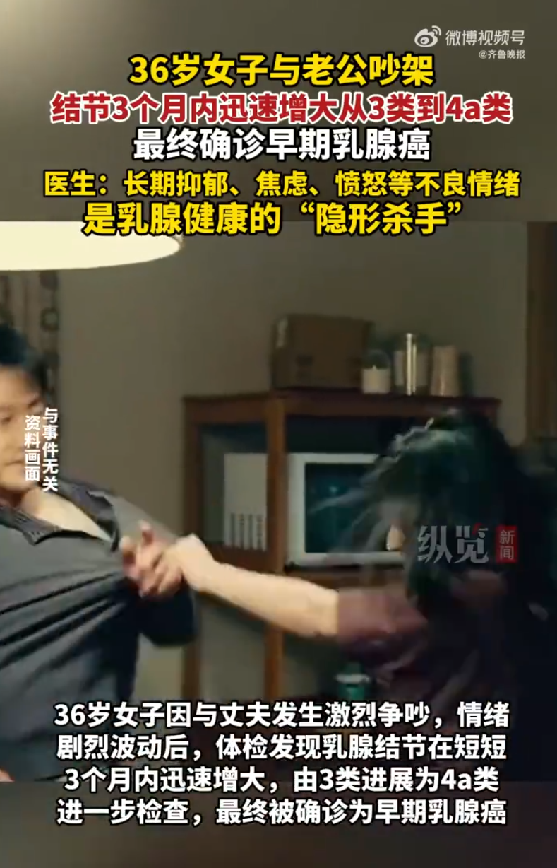 近日,河南郑州一36岁女子因与丈夫发生激烈争吵,情绪剧烈波动后,体检发现乳腺结节在短短3个月内迅速增大,由3类进展为4a类。经进一步检查,最终被确诊为早期乳腺癌。
