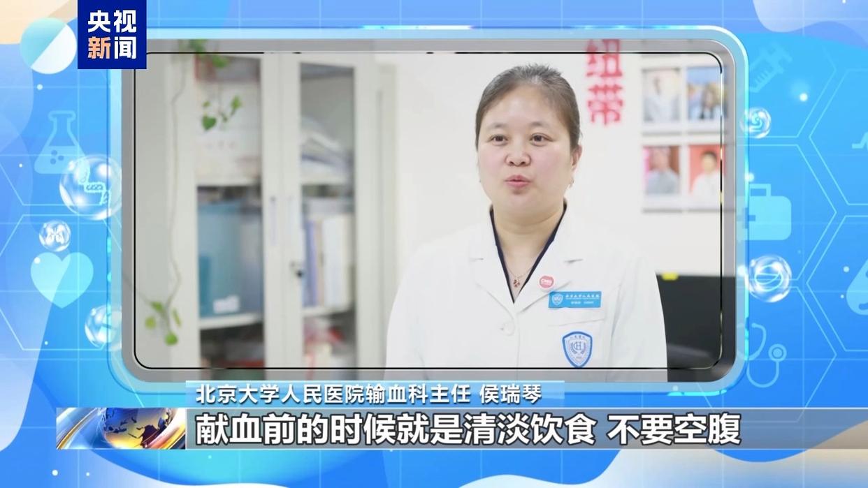 北京大学人民医院输血科主任 侯瑞琴:献血前的时候要清淡饮食,不要空腹,这样才能更有利于献血整个流程的顺利,同时也不要吃得太油腻。献血前可以补充一些水分,刻意去喝水是没有必要的。