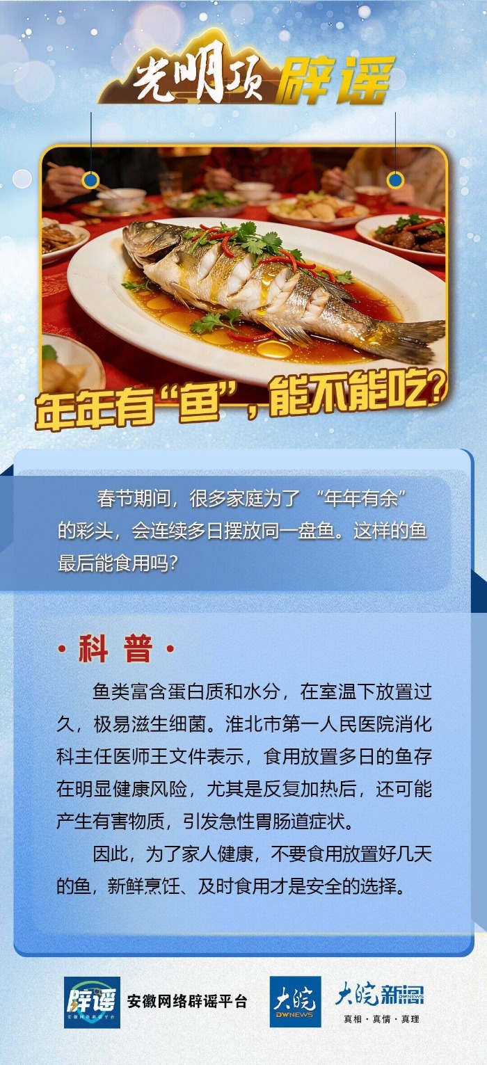 大皖新闻讯 过年期间,很多家庭的餐桌上都会有一盘鱼。在很多地方的风俗习惯中,这盘鱼会很多天都出现在餐桌上,以讨得“年年有余”好彩头。不过,这盘放了很多天的鱼后来到哪里去了呢?有网民表示,很大可能会被习惯于节俭的家中老人吃了。那么,这样连续放置多日的鱼,到底能不能吃呢?淮北市第一人民医院消化科主任医师王文件表示,放置多日的鱼可能会滋生细菌导致变质,如果食用可能导致健康风险。
