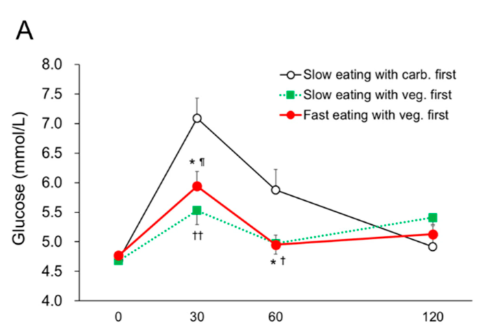 2023年发表在《营养素》上的一项研究显示,摄入同样的食物,先吃蔬菜再吃主食,能改善餐后血糖和胰岛素水平。