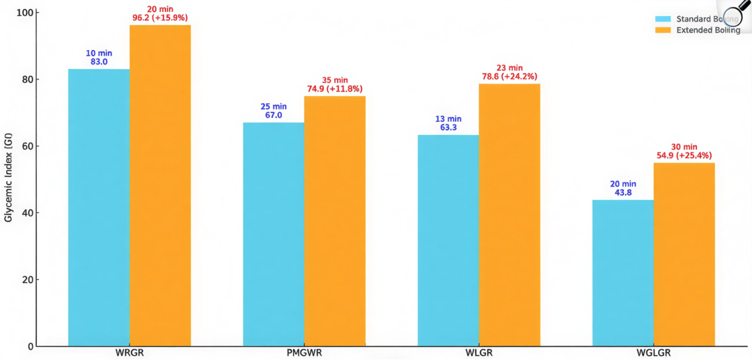 △不同品种的大米在延长水煮时间后,GI数值均有提升