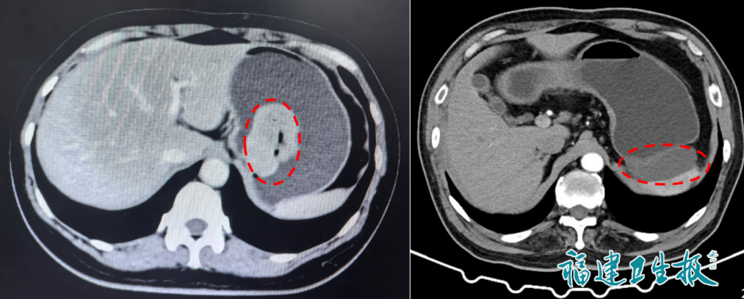 ▲胃肠道间质瘤的CT表现(左:内生型;右:外生型)