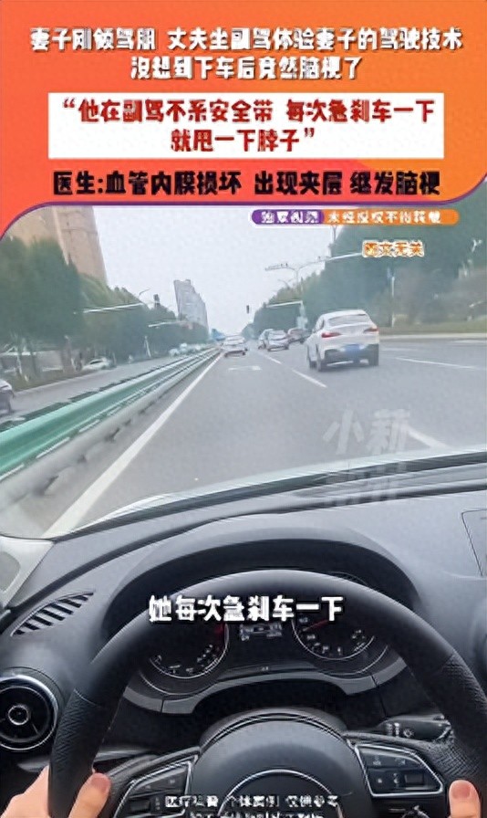 3月8日,河南郑州30多岁丈夫坐副驾体验妻子的驾驶技术,妻子刚领驾照,陪妻子练车,没想到下车后竟然脑梗了。