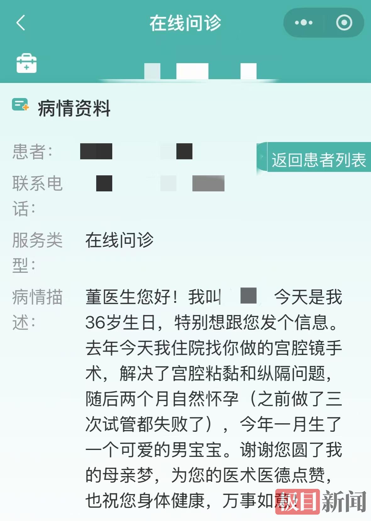 据了解,吴女士是通过在线问诊平台付费8.5元后发出这条信息的。她没有医生的私人联系方式,只能通过这一方式表达心意。