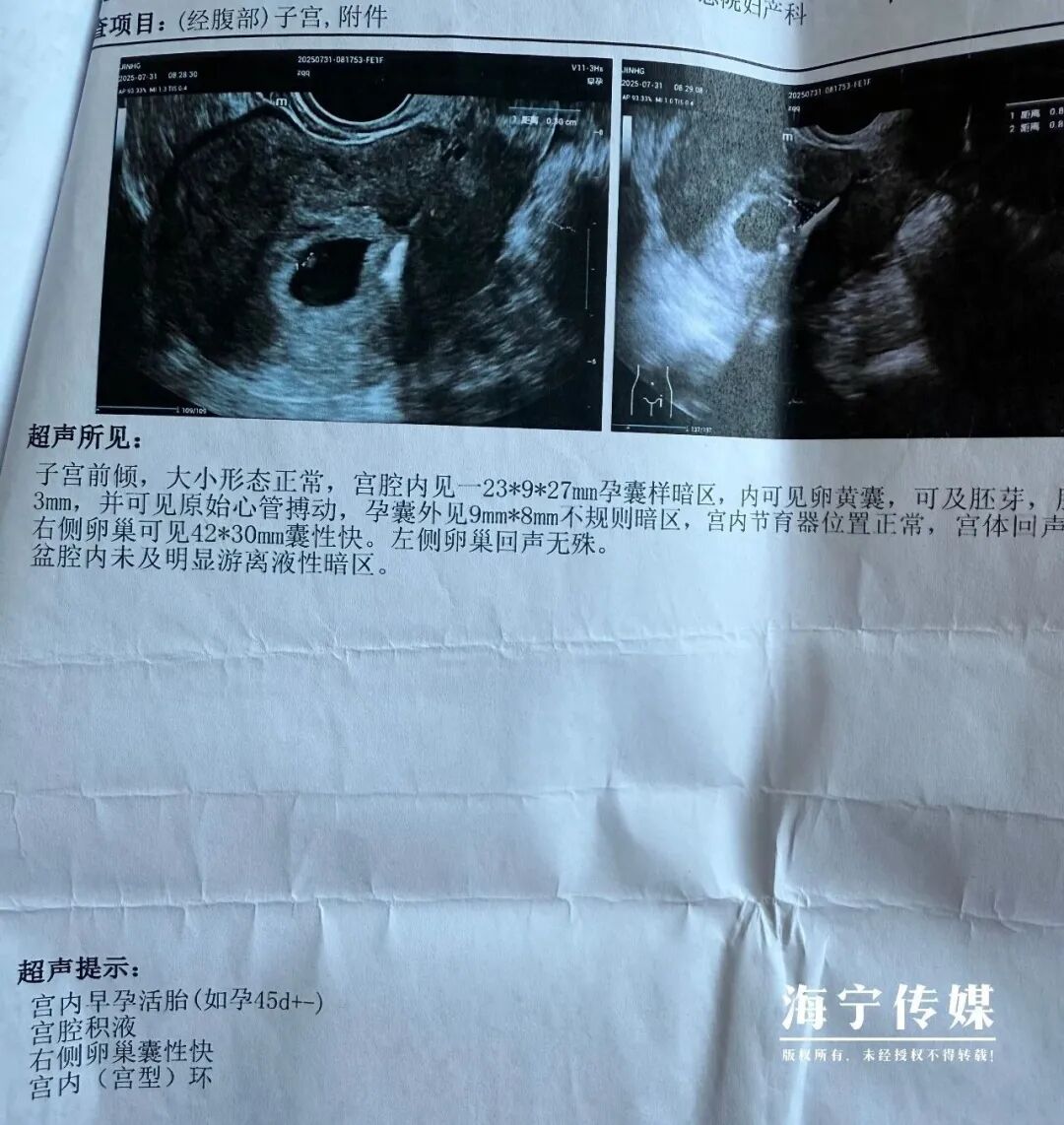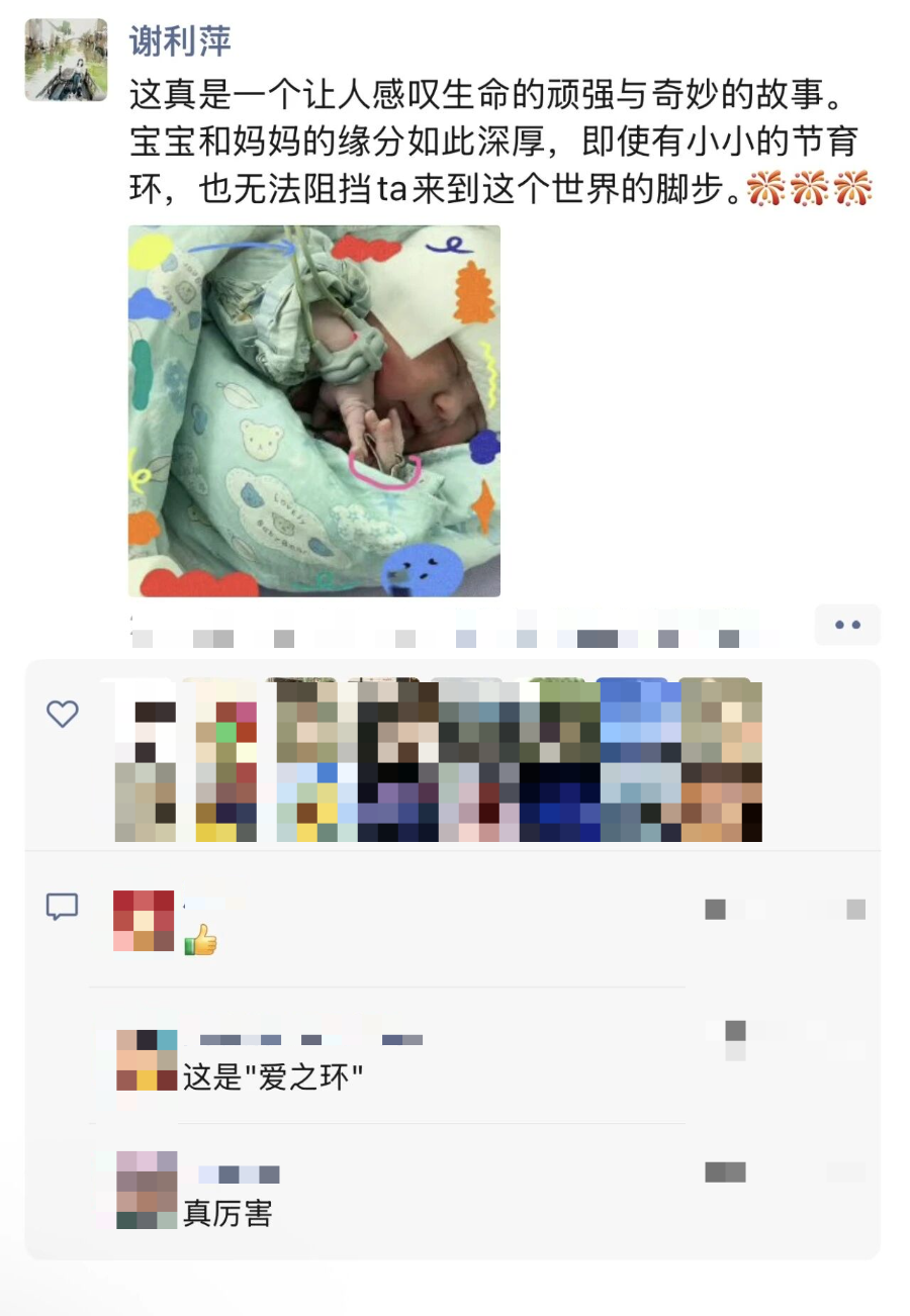 今年35岁的张女士是河南人,2015年就来到海宁工作生活,至今已有10个年头,家里还有一个8岁的大儿子。早在第一次剖宫产后,她就放置了宫内节育环避孕,原本和丈夫商量好“暂时不生二胎”,没想到去年7月,意外突然降临。“大概怀孕一个半月才查出来,当时整个人都懵了,上环怎么还能怀孕?”张女士回忆,最初的震惊过后,她和丈夫看着检查单反复商量,最终决定留下这个孩子:“既然来了就是缘分,肯定是上天给我们的礼物。”整个孕期,张女士身体状态平稳,没有剧烈孕吐,各项产检也都“一路绿灯”。今年3月12日,她在海宁市人民医院剖宫产下一名7.5斤重的女婴,如愿儿女双全的她抱着宝宝笑得合不拢嘴:“在海宁打拼这么多年,这下终于凑成‘好’字了。”手术台上,当宝宝顺利娩出后,医护人员在胎盘旁发现了那枚完整的节育环——正是它“失效”,才让这个小生命得以降临。为了记录这份难得的生命奇迹,医护人员特意将节育环轻轻套在宝宝的小手上,拍下了这张充满温情的照片,也正是这张照片,让产科主任谢利萍忍不住在朋友圈感慨:“即使有小小的节育环,也无法阻挡她来到这个世界的脚步。”“带环妊娠并顺利生产的情况非常少见,我从业这么多年,碰到的也就个位数。”谢利萍告诉大潮君,这类情况医学上称为“带环妊娠”,多因节育环位置下移、型号不符或超期使用导致避孕失效。她解释,带器妊娠其实风险很高,容易引发流产、宫外孕,甚至可能影响胎儿发育,但张女士的情况格外幸运:“环没有嵌入胎盘或胎儿身体,宝宝发育完全正常,这真的是生命的奇迹,也让我们这些医护人员格外动容。”1.定期检查:放环后需通过B超监测环的位置,防止下移、脱落;