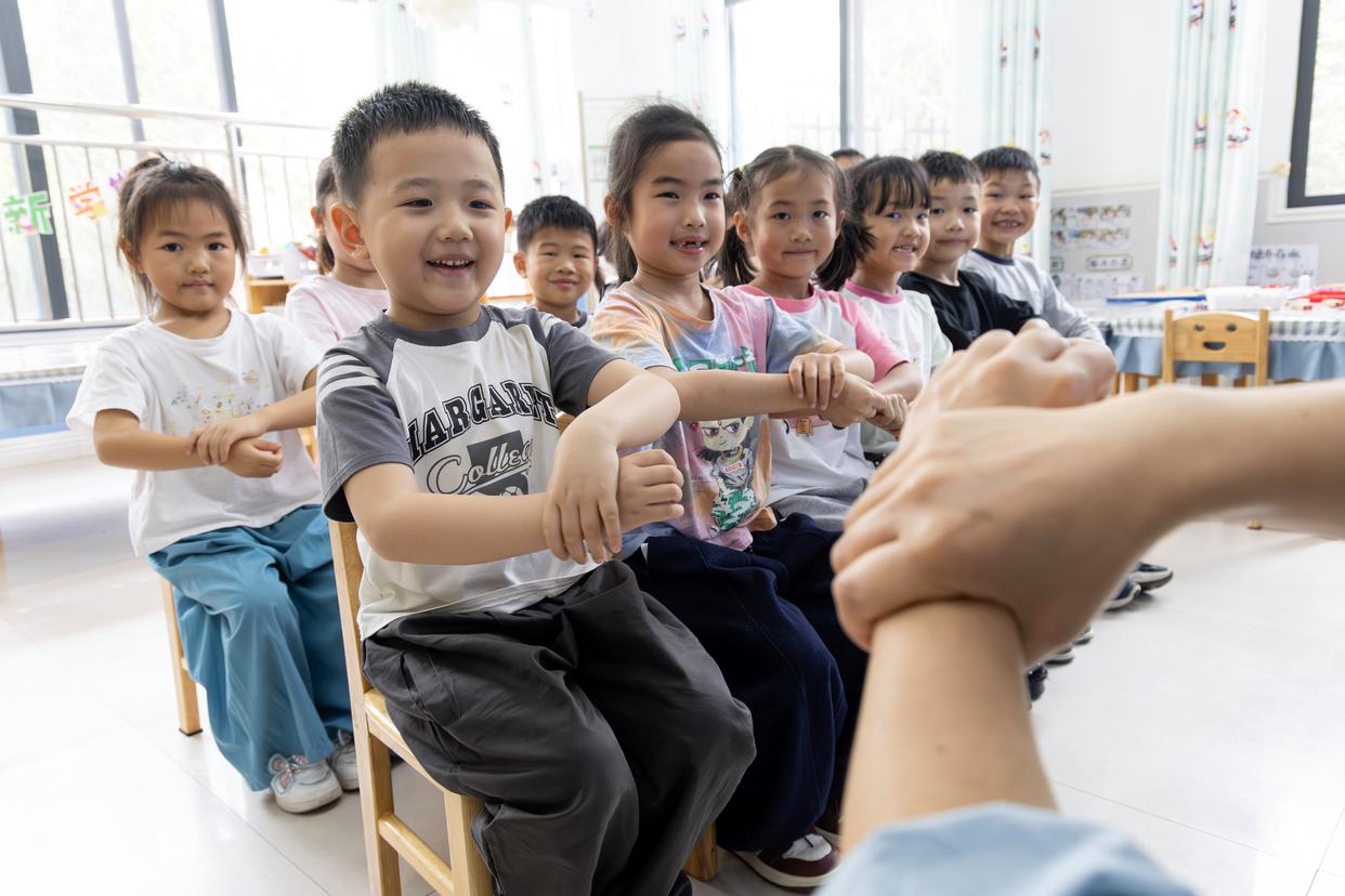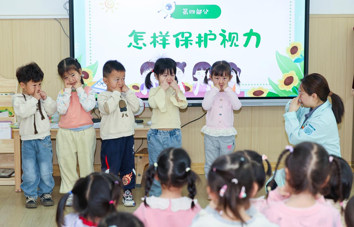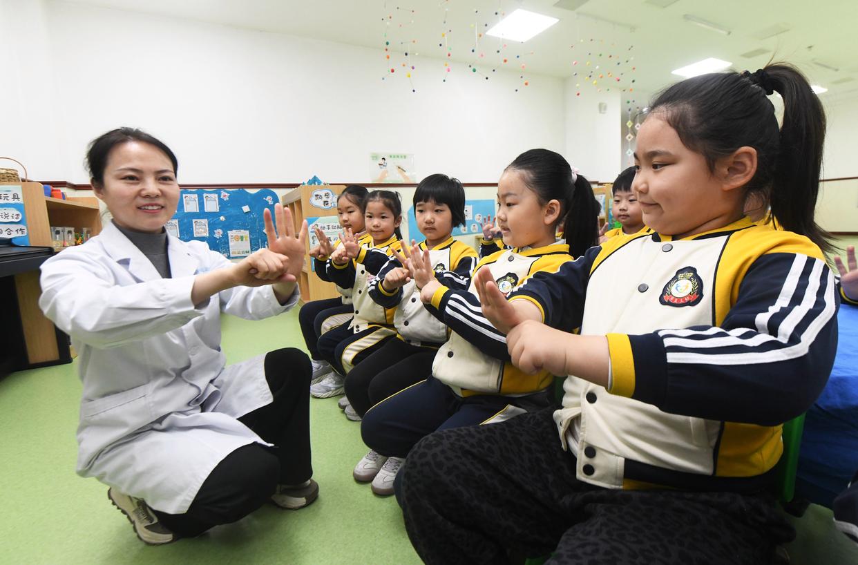 4月7日,在河北省石家庄市华北幼儿园,小朋友在眼科医生的指导下学习眼保健操,科学保护眼睛。新华社发(梁子栋摄)