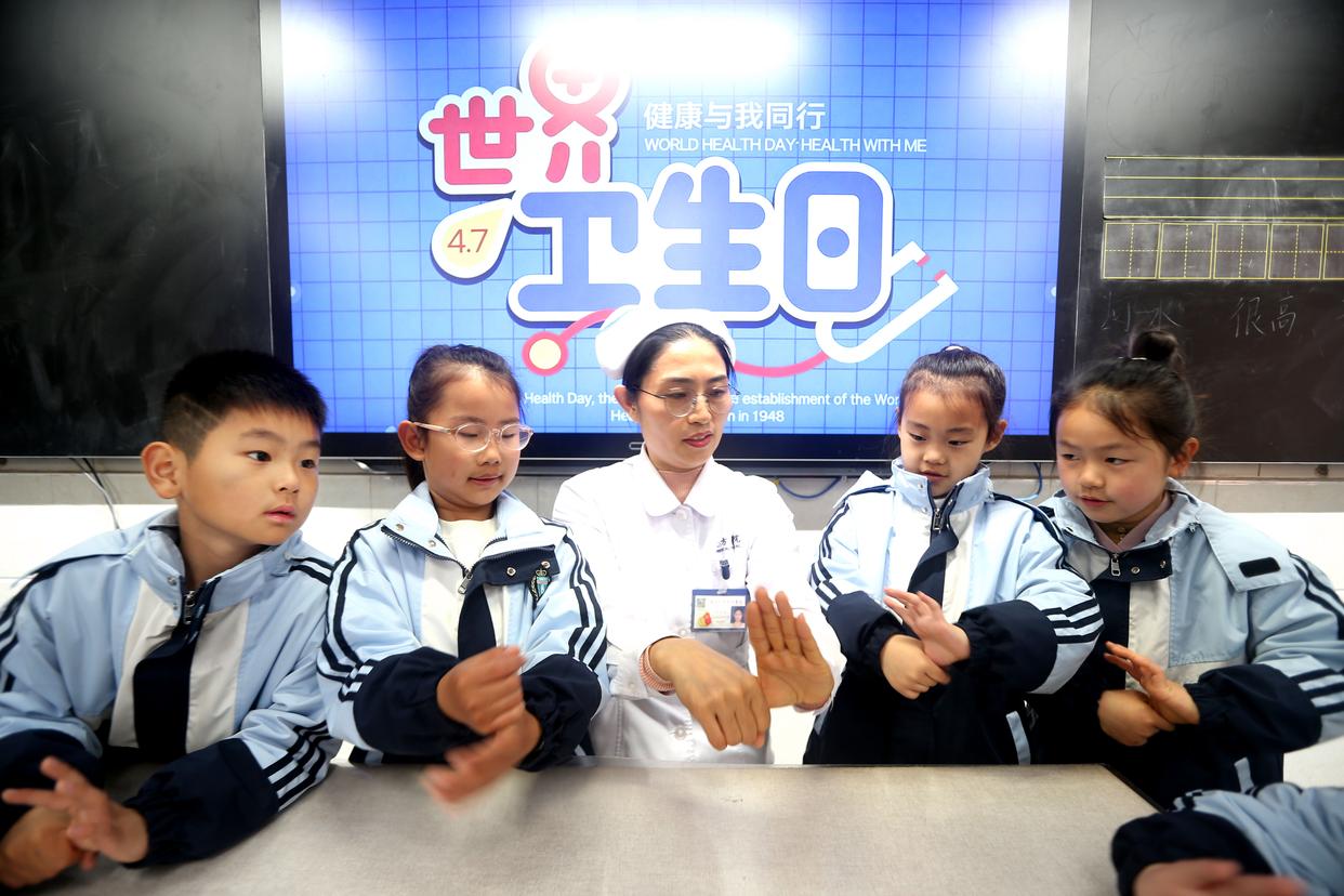 4月7日,河北省邯郸市第二医院医务人员教邯山区实验小学学生正确洗手方法。新华社发(郝群英摄)