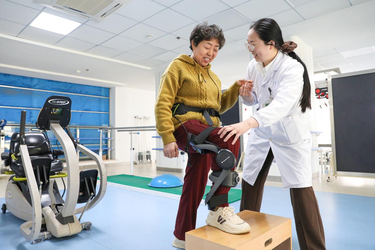 4月7日,在江苏省海安市中医院康复训练中心,患者在治疗师指导下穿戴外骨骼机器人进行康复训练。新华社发(顾彬斌摄)