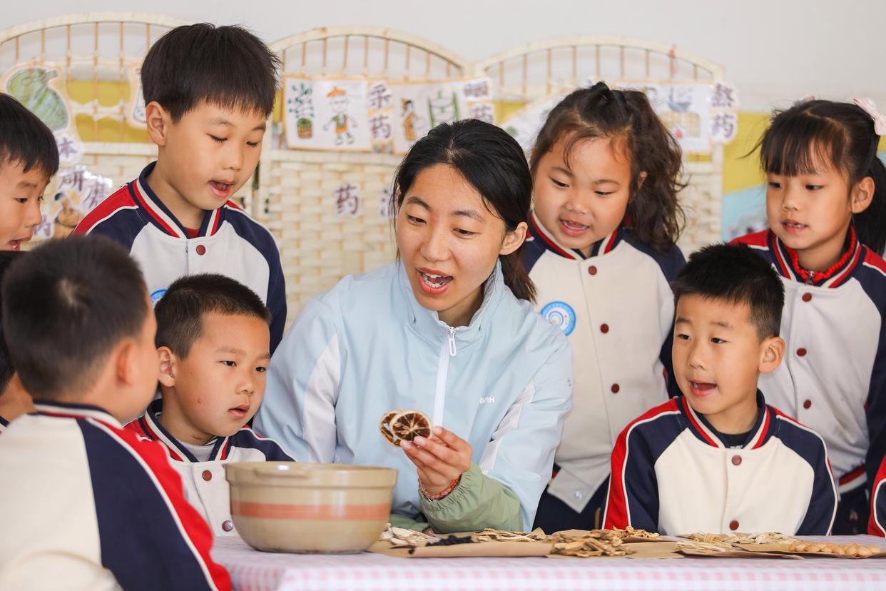 4月7日,在山东省青岛市李沧区青峰路幼儿园,老师教小朋友认识中药材。新华社发(张鹰摄)