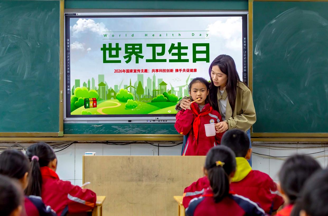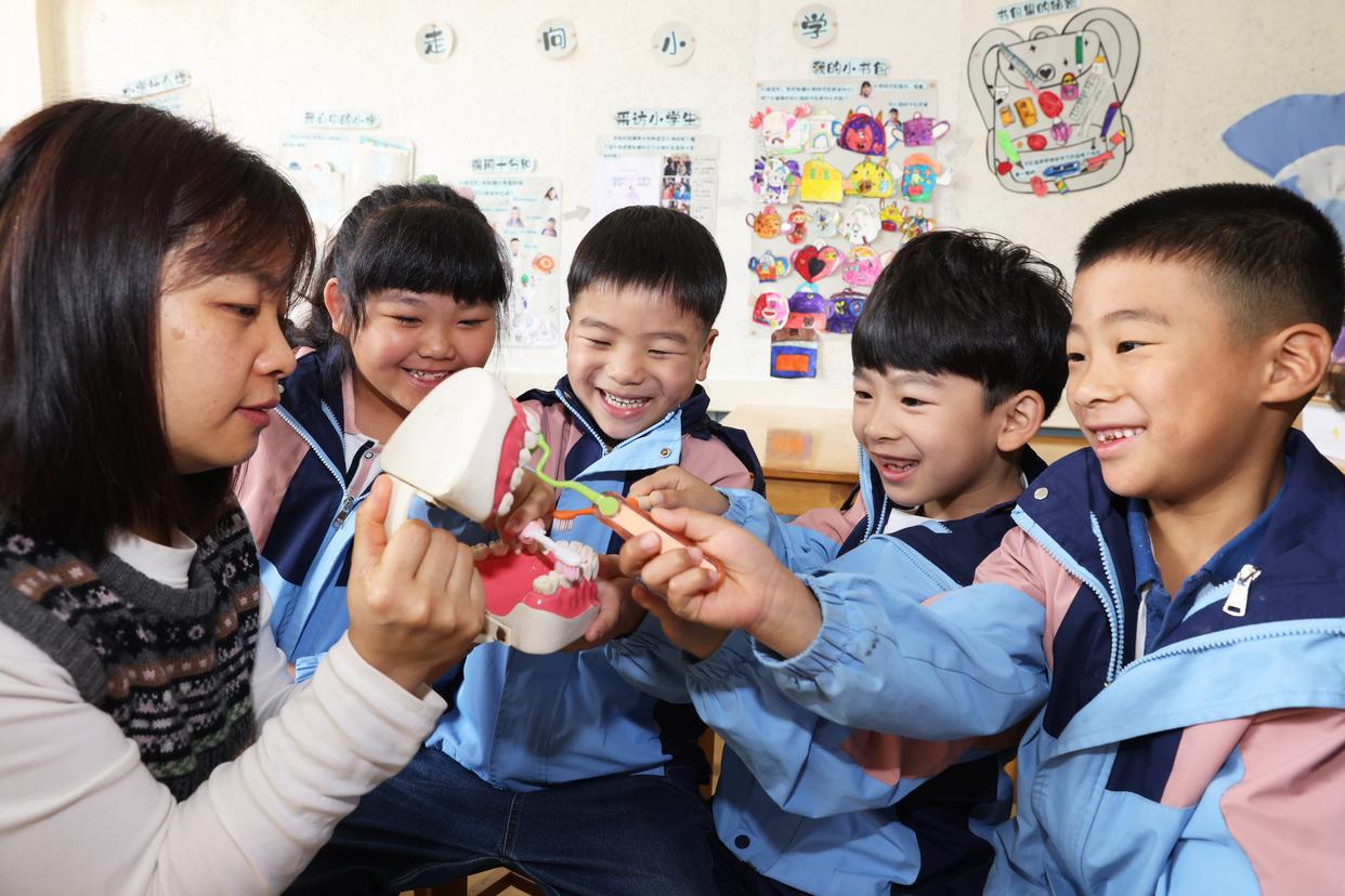 4月7日,老师在贵州省黔西市第一小学指导学生正确涮牙。新华社发(范晖摄)