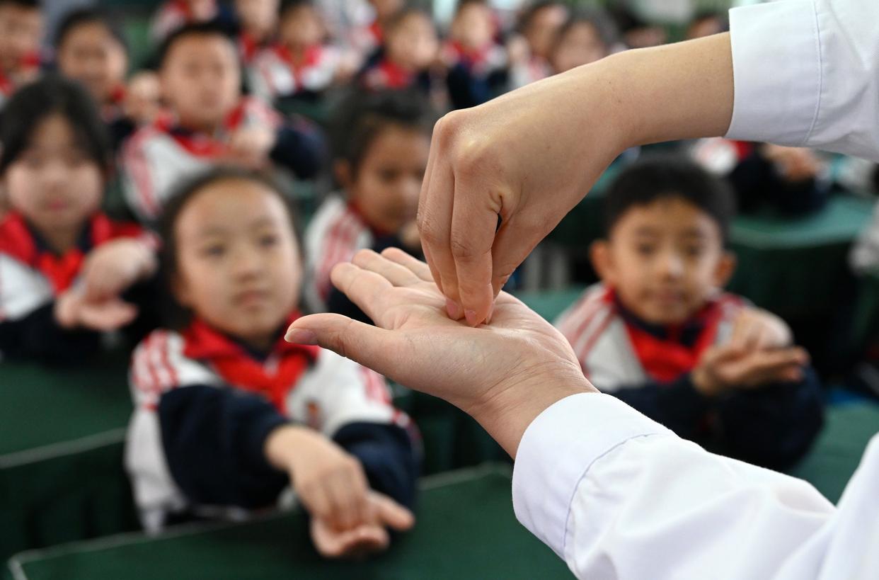 4月7日,在江苏省连云港市院前小学,医务人员给学生讲解“七步洗手法”。新华社发(王春摄)