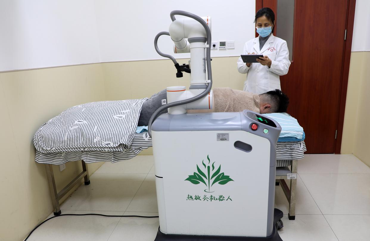 4月7日,在山东省滨州市博兴县中医医院灸疗室,医护人员用热敏灸机器人为患者进行艾灸治疗。新华社发(陈彬摄)