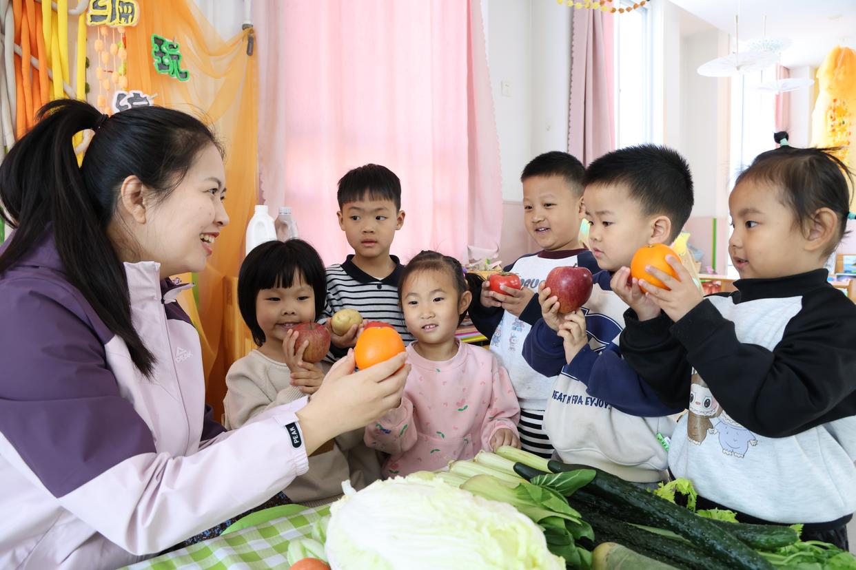 4月7日,在河北省石家庄市新华区柏林幼儿园,校医通过趣味食育课堂引导幼儿养成健康饮食习惯。新华社发(陈其保摄)
