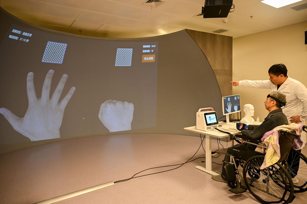 4月7日,在贵州省贵阳市北京积水潭医院贵州医院,医生在指导患者进行脑机接口康复训练。新华社发(袁福洪摄)